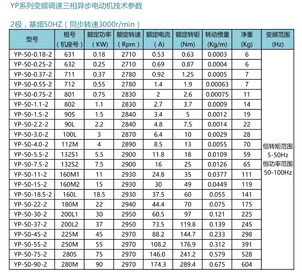 YP變頻系列2極型號(hào):